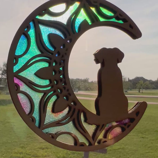 This enchanting Dog on the Moon Stained Glass Effect Wood and Acrylic Suncatcher is a perfect blend of rustic charm and modern elegance. This exquisite Dog Mom Suncatcher is an ideal gift for those who cherish their four-legged friends and seek to bring a touch of whimsical beauty into their homes. The delightful design, featuring a dog perched on a crescent moon, captures the imagination and reflects the special bond between a pet and its owner. Whether it's a birthday, housewarming, or just because, this dog lover gift will warm the heart of any recipient.