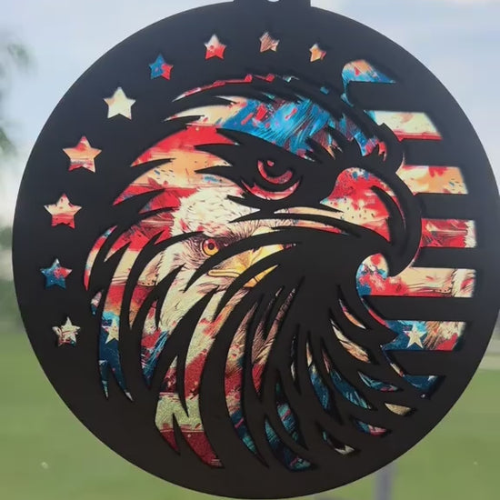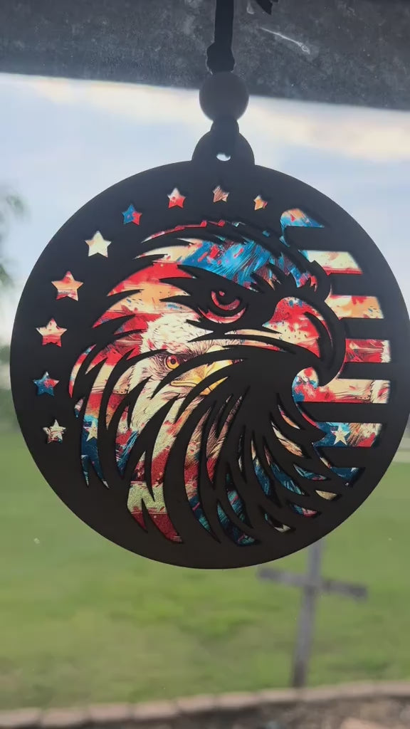 Eagle Flag Suncatcher - Rustic Wood & Acrylic Art, 4.75”