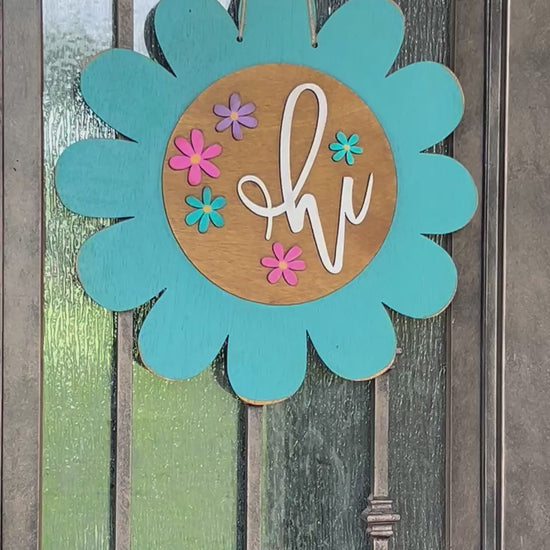 Turquoise Flower Door Hanger - Rustic Wood, Vibrant Colors